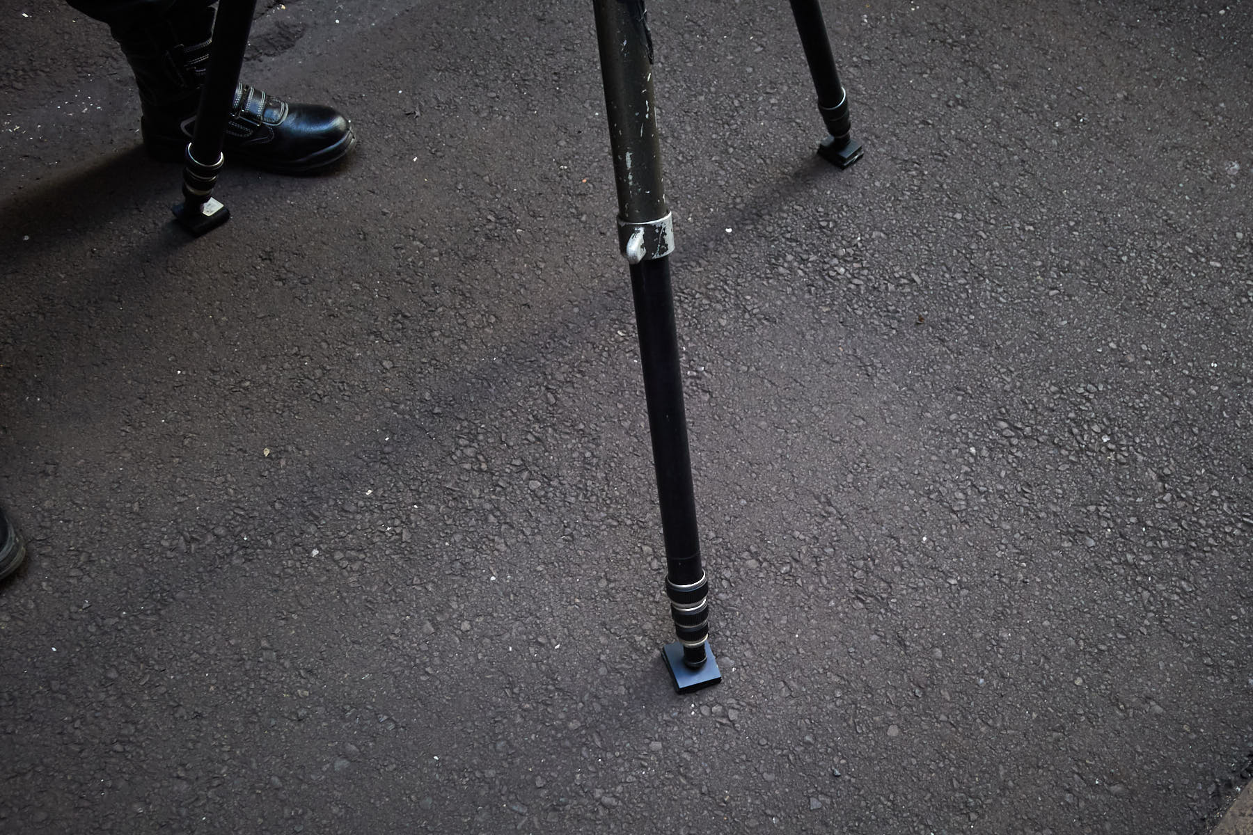 この現場の地面は微振動があるため、三脚の石突にラバー素材を敷いて「ブレ軽減」を目論んでいます。効果のほどは不明なので、「やらんよりまし..」的な対策です..。