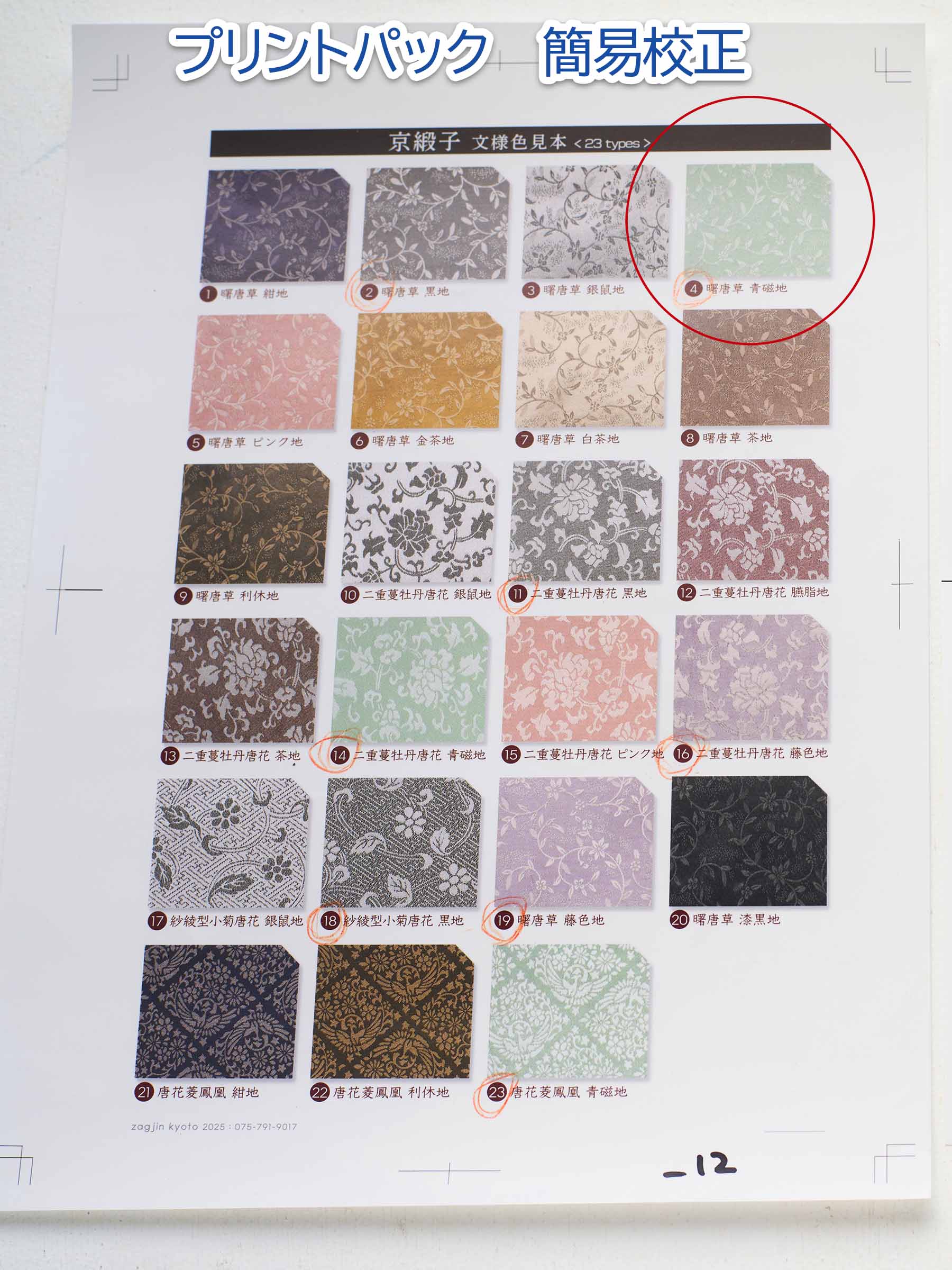 そして、上が本刷りの前に出す色校正(簡易校正)。本機校正ではないのでざっくりとしか合いませんが、おおよその目安にはなるかとおもいます。(本機校正は500部刷るよりお高いので、)商品現物と見比べて、外してるなぁと思うものを、赤鉛筆で丸をつけています。(データ修正が必要なもの)