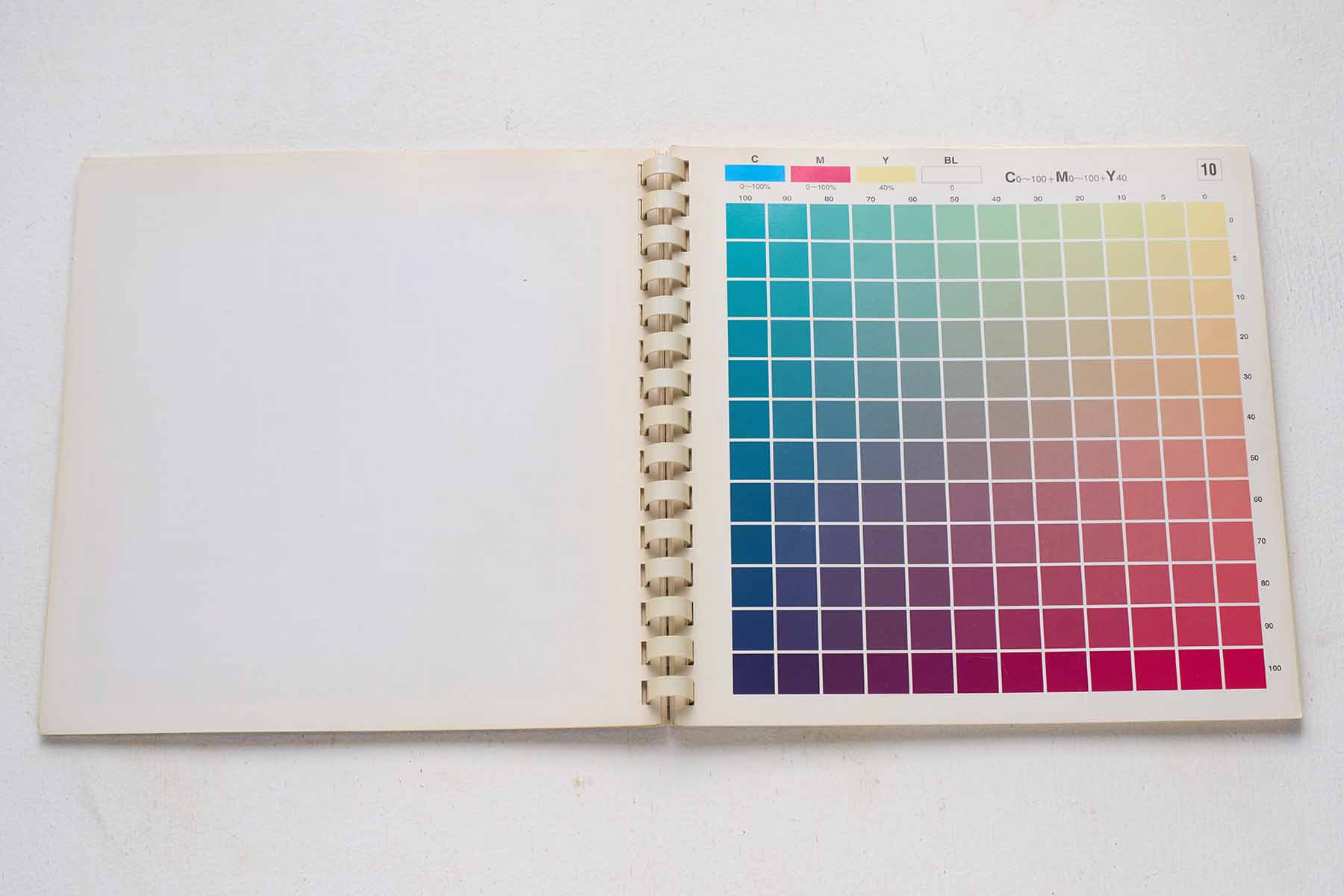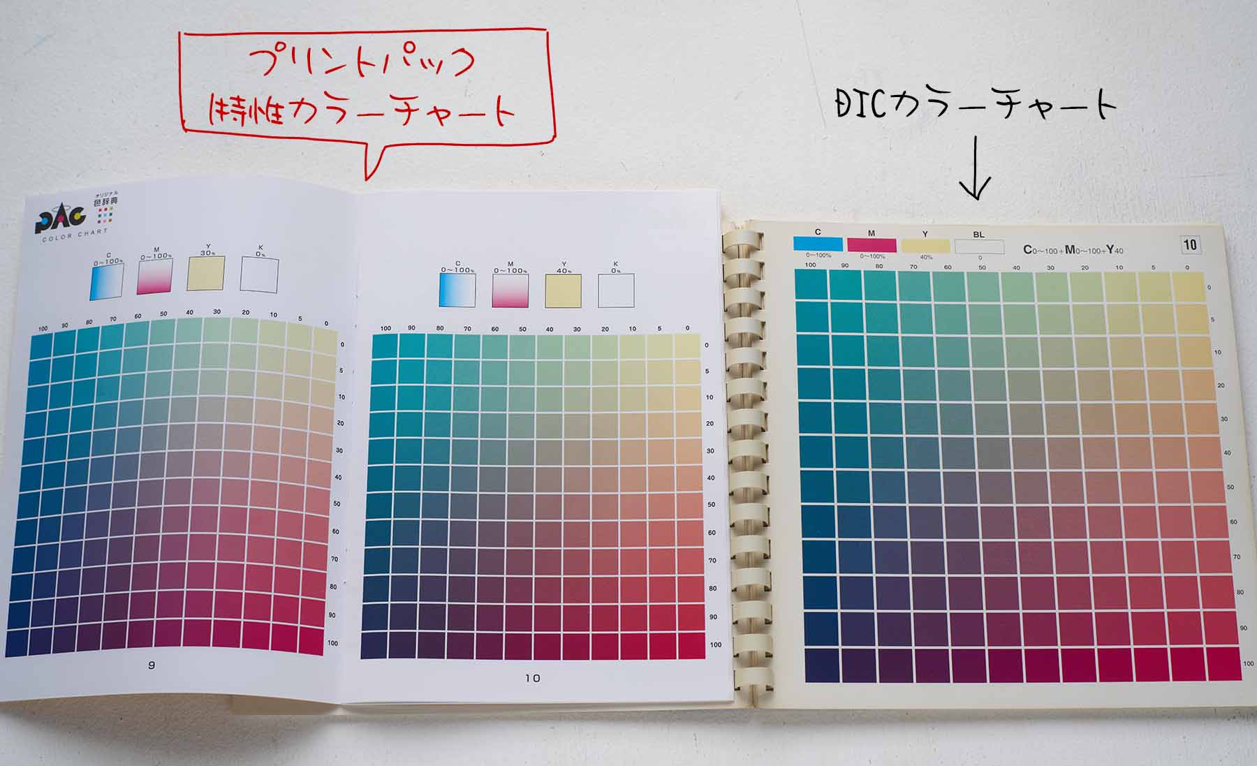 プリントパック さんに会員登録すると「特性カラーチャート」が無料で送ってもらえます!十分このチャートで役にたつとおもいます。同時に「オフセット印刷 印刷用紙 基本セット」もオーダーすると良いと思います。(サンプル請求のバナーからどうぞ)