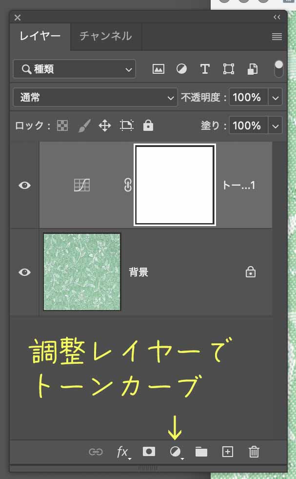 4.「レイヤー」ウィンドウ から、「トーンカーブ」レイヤーを選択。→「プロパティ」ウィンドウ を開くと「トーンカーブ」が表示される。