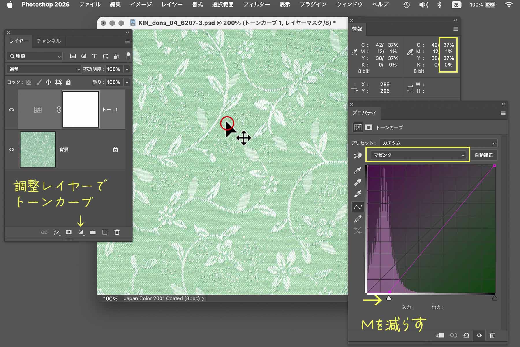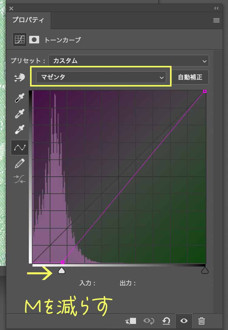 トーンカーブのMチャンネルの左下スライダーを右にスライドさせる。(Mが減るように調整)