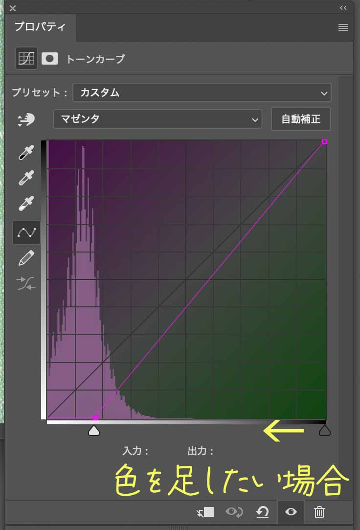 ※とはいえ「色を足したい」ときもあります。その場合、トーンカーブ右下を右へ