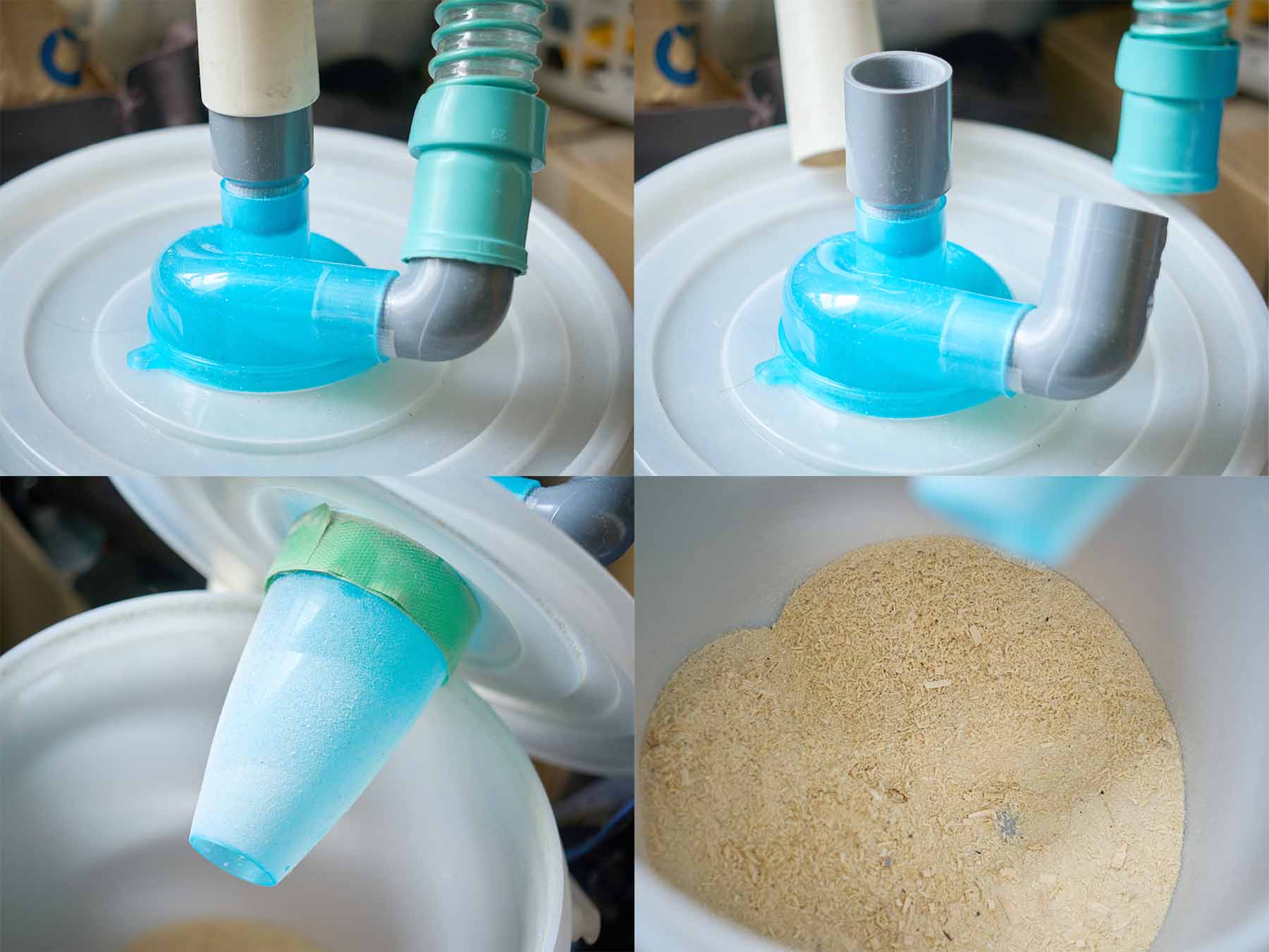 ホムセン購入の「塩ビパイプ ジョイント」で、口径変換してホースとセパレータパーツを接続。これで集塵機完成!