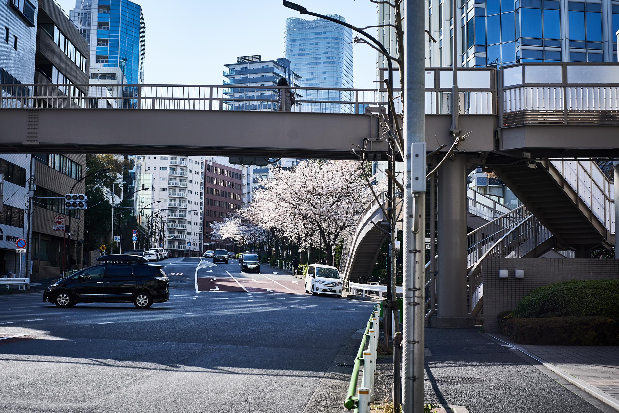 同じ歩道橋の上から逆側、「順光(ややサイド)」に照らされた桜は、こう写りました。